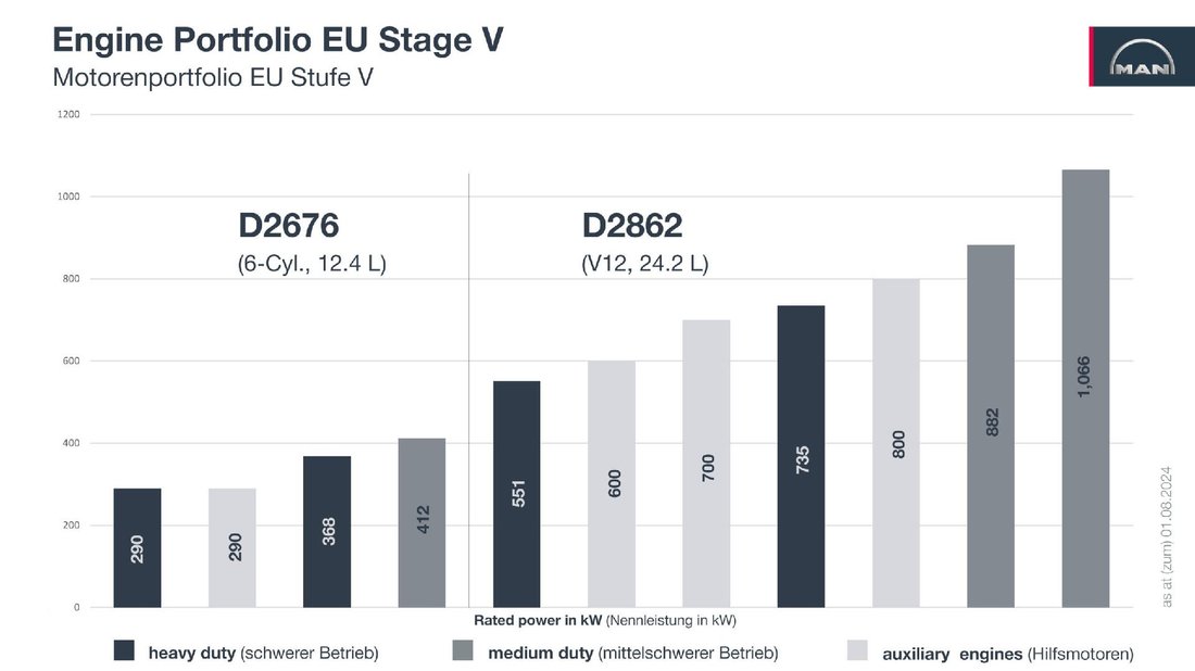 The new MAN D3872 engine, based on a completely new basic engine and inspired by the proven MAN D2862 V12 engine series, sets new standards in terms of durability, reliability and future viability. With an injection pressure of 2,200 bar and the new MD1+ engine control unit, optimum engine adjustment is achieved, resulting in low fuel consumption and outstanding raw emissions. Another development goal was high power density, with the most powerful variant D3872 LE433 achieving an impressive 1,618 kW (2,200 hp) at a dry weight of just 2,720 kg. Despite this increase in power, the MAN D3872 is based on the compact installation dimensions of the smaller MAN D2862 V12 engine with a displacement of 24 liters. Only the length has been increased by 100 mm to 2,335 mm, while the connection dimensions have remained identical.