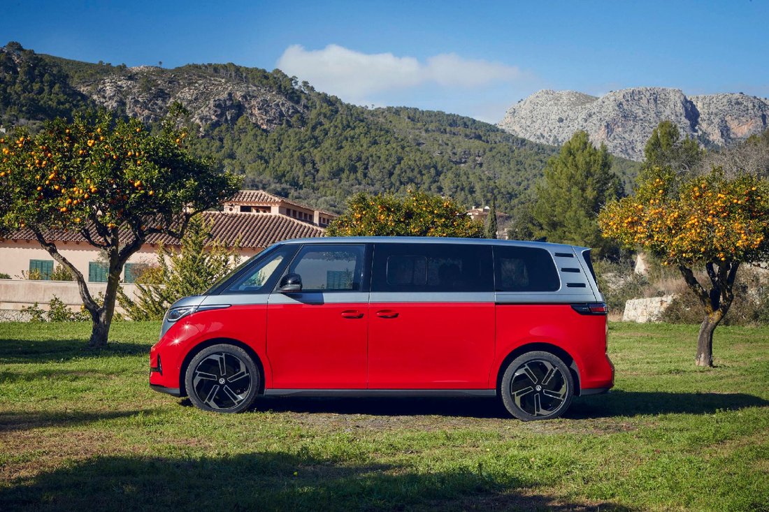The ID. Buzz GTX is characterised by an individualised front end. A bumper in GTX styling with a black air intake grille in honeycomb design and new side air guide elements also ensure a dynamic, distinctive appearance. New daytime running lights are integrated into the bumper on the left and right. All black body elements such as the new air intake grille, air guide elements, GTX lettering and the exterior mirror housings are finished in high-gloss black. In addition, the Solna 20-inch alloy wheel is standard equipment for the ID. Buzz GTX. The range of GTX wheel rims is supplemented by two new 21-inch alloy wheels. Always fitted as standard are IQ.LIGHT LED matrix headlights. A new paint finish in the colour Cherry Red is offered exclusively for the ID. Buzz GTX. This red will be configurable as a solid paint finish and optionally in combination with Mono Silver metallic as a two-tone paint finish.